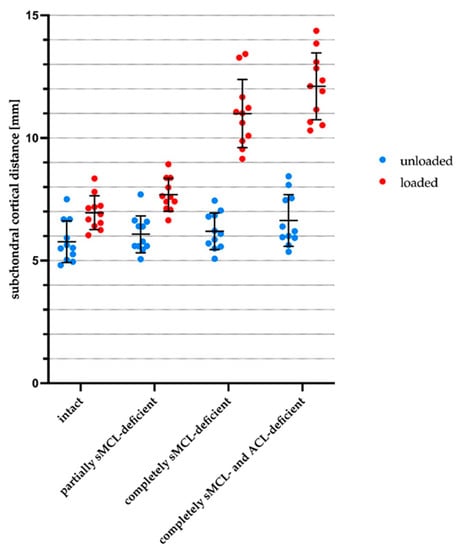 Complete sMCL deficiency was characterized by distinct increases in medial compartment opening in the loaded configuration and only marginal (yet statistically significant) increases in the unloaded configuration. Mean SCD values increased to values of 11.0 ± 1.4 mm (loaded, p ≤ 0.001) and 6.2 ± 0.7 mm (unloaded, p < 0.01). In light of the separate and non-overlapping value distributions, possible mean SCD cut-off values for differentiating the completely sMCL-deficient loaded configuration from the completely sMCL-deficient unloaded configuration or from the intact loaded configuration are 7.5 mm to 9.0 mm or 8.4 mm to 9.0 mm, respectively. Of note, the most pronounced increase in SCD values between two consecutive joint conditions and loaded configurations was determined between partial and complete sMCL deficiency, indicating the greatest loss in joint stability after complete sMCL transection.