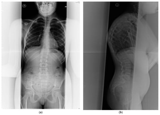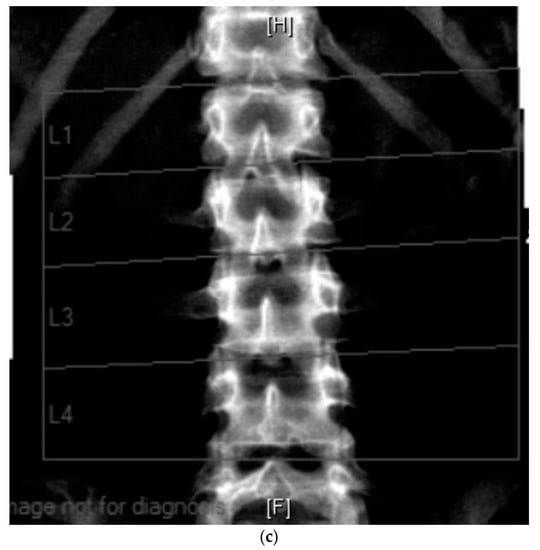 (a) Anterior posterior view—whole spine x-ray in a 25-year-old female patient affected with PMM2-CDG; bone mineral density is below expected for her age (T score −2.6, z-score −2.6); (b) lateral view; (c) radiological features of her lumbar spine: there is a double mild curve scoliosis and no rotational deformity. All pedicles are visualized. There is impression of slight upper hyperkyphosis and impression of multilevel Schmorl’s nodes.
