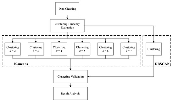 Thirdly, K-means cluster analysis is conducted with different cluster numbers, namely k = 2, 3, 4, 5, 6, and 7. DBSCAN method is applied to analyze the data as well.