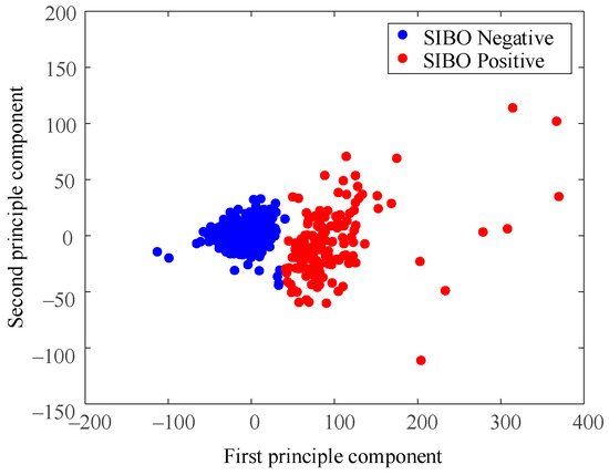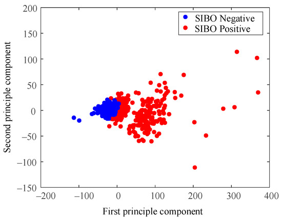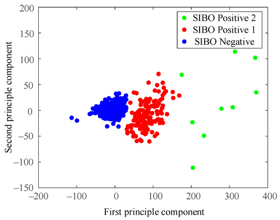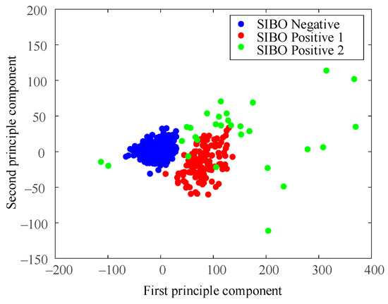 Figure 8 is the result of using the North American Consensus presented with PCA dimensional reduction. Samples were labeled SIBO-negative in blue if the H2 level increased less than 20 p.p.m. from baseline within 90 min with the standard of 2017 North American Consensus. The North American Consensus threshold was stiff since it seemed to classify the samples into positive group and negative group by forcing a cut-off line in the data space without considering the data boundaries. As a result, a large amount of data samples were regarded as SIBO-positive by the North American Consensus, though they were very similar to the negative ones from the perspective of data-space distribution.