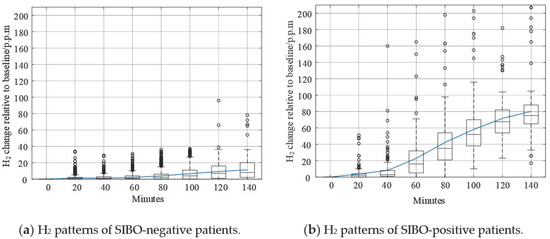 Different typologies of data curves are shown in Figure 5. The solid curve in the figure was mean value of H2. In Figure 5a, the H2 curve is approximately flat since the increase of H2 level was not remarkable. Additionally, the mean value and median value of H2 level did not exceed 20 p.p.m. within 140 min. According to the North American consensus, this pattern could be confidently regarded as SIBO. However, it was also noticeable that some data samples of this kind exceed 20 p.p.m. within 90 min, which challenged the North American consensus. In Figure 5b, the H2 level mean value curve increased steadily after taking lactulose and exceeded 20 p.p.m. at 60 min. This curve could be confidently believed as SIBO-positive.