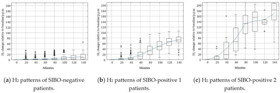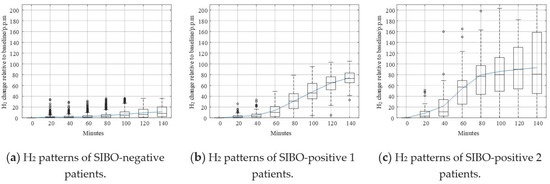 Shown in Figure 7 are different typologies of data curves. The solid curve represents the mean value of H2. Like that in Figure 5a, the H2 curve in Figure 7a is relatively flat compared to other curves. The increase of H2 level was not remarkable, and the mean value and median value of H2 did not exceed 20 p.p.m. within 140 min. According to the North American consensus, this pattern could be confidently regarded as SIBO-negative since less H2 gas was produced after taking in lactulose. In Figure 7b, the H2 curve increased steadily after the beginning of breath testing. The H2 increasing level exceeded 20 p.p.m. around 60 min. The trend of the pattern in Figure 7b is similar to the pattern in Figure 5b. In Figure 7c, the H2 curve increased dramatically after the beginning of the breath test. The H2 increasing level exceeded 20 p.p.m. earlier than 60 min. The increasing speed slowed down after 80 min, but kept increasing until the end of breath testing.