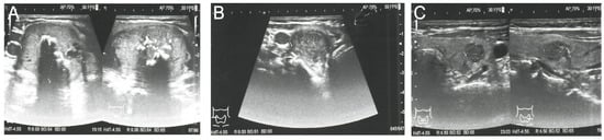 Preoperative ultrasound of the thyroid gland and the EU-TIRADS categories of thyroid nodules. (A) Right lobe, showing the dominant thyroid nodule, measuring 35 × 29 × 41 mm, with macrocalcifications; EU-TIRADS 4. (B) Right lobe, showing a second hypoechogenic nodule 22 mm in width and 16 mm in height; EU-TIRADS 4. (C) Left lobe, showing a hypoechogenic nodule, measuring 9 × 7 × 9 mm, with irregular margins; EU-TIRADS 5.