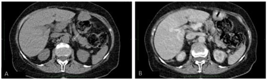 Abdominal computed tomography (A) without and (B) with contrast of a focal lesion in the left adrenal gland.