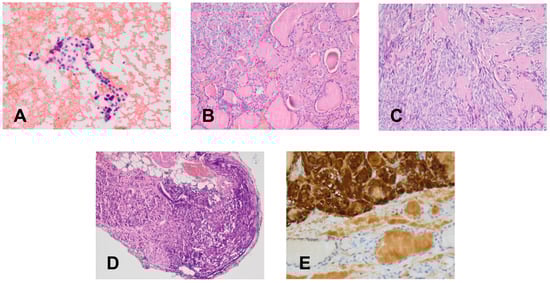 In March 2020, after clinical exclusion of PHEO, the patient was administered pre-operative alpha-blockade, followed by total thyroidectomy with bilateral neck dissection. Histologically, bilateral MTC was diagnosed, with the lesions in the right and left lobes measuring 40 mm and 19 mm, respectively. Histologically, bilateral MTC of stage pT2N1b (Figure 4C–E) with angioinvasion and positive margin status (R1) was recognized. Two metastatic lymph nodes, measuring 4 mm in maximum diameter, were detected in the right cervical lateral compartment, accompanied by extranodal extension, but no metastatic nodes were detected in the central and left cervical compartments. Multifocal C-cell hyperplasia was also identified in the left thyroid lobe and isthmus (Figure 4B).