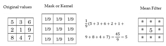 Particularly, the mean filter, which contemplates that the kernel goes through the whole image, and the result of the product of each element by a pixel of the corresponding image are calculated to obtain the average of these and to be placed in the position corresponding to the image. Figure 1 shows a simple example of how the mean filter is applied to a given pixel.