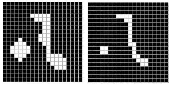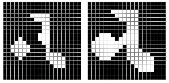 To calculate the erosion of a binary image by its structuring element, we use each pixel of the set . For each object pixel, the structuring element is superimposed so that the origin of the structuring element coincides with the coordinates of the input pixel. If each pixel of the structuring element corresponds to that of the object, then the input value retains its value; otherwise, the object pixel takes the value of the image background (in binary images, the value zero corresponds). Figure 2 shows the effect of applying erosion to a binary image.