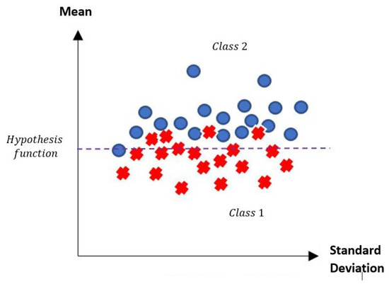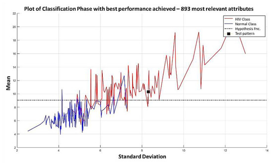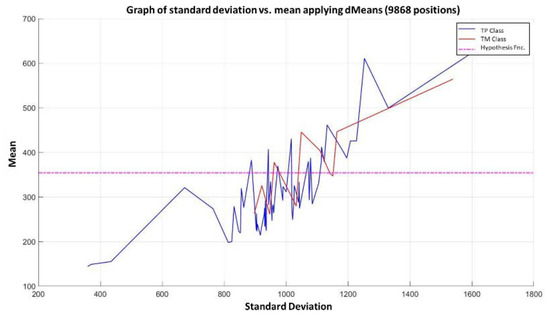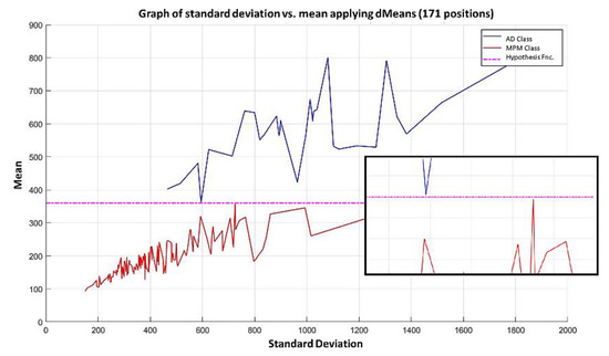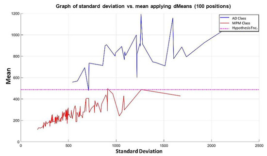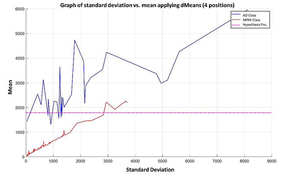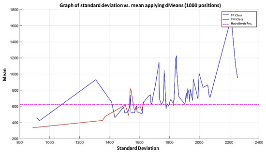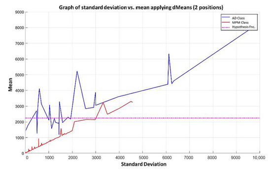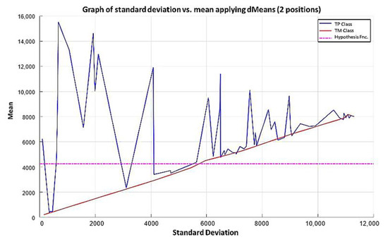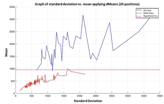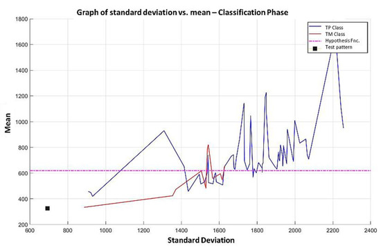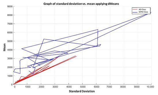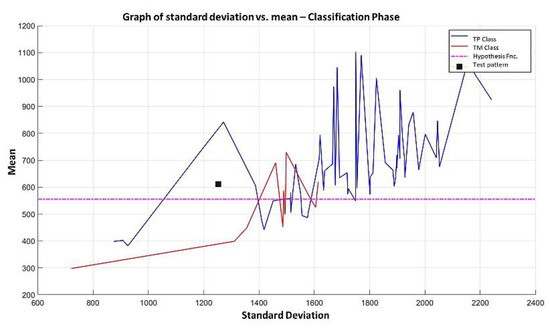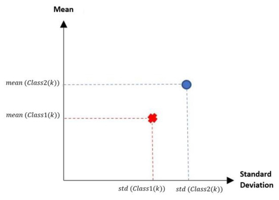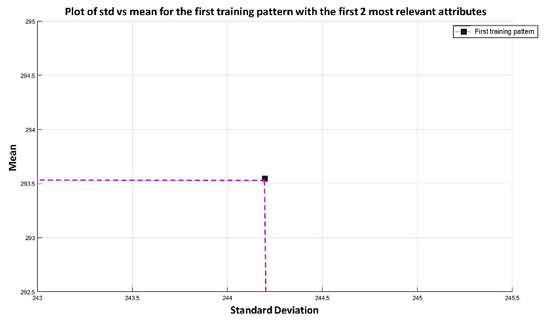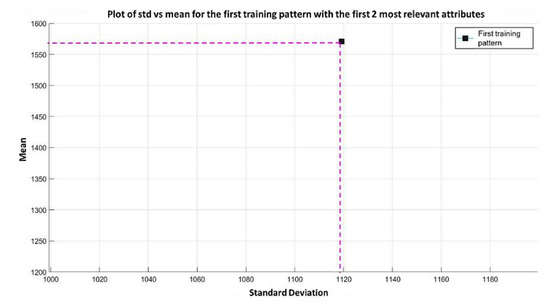 According to the MML paradigm, each of the patterns will go from having attributes to only two attributes. These two attributes are real numbers, which are calculated by the standard deviation and mean of each of the patterns [17], thus becoming a dataset of size . The first attribute corresponds to the calculated standard deviation value, and the second attribute corresponds to the calculated mean value. By performing these two calculations, it is possible to visualize in the Cartesian plane the behavior of each of the patterns. The -axis corresponds to the standard deviation value, while the -axis is conditioned to the mean. Figure 4 shows an example of how a pattern of each class can be visualized in the Cartesian plane.
