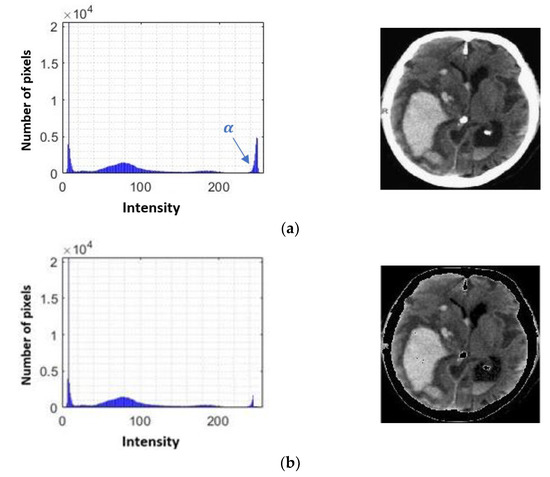 Figure 9 shows an example of the representation of the level over the histogram for a brain CT image without hemorrhage and with the presence of hemorrhage and the effect caused by image segmentation.
