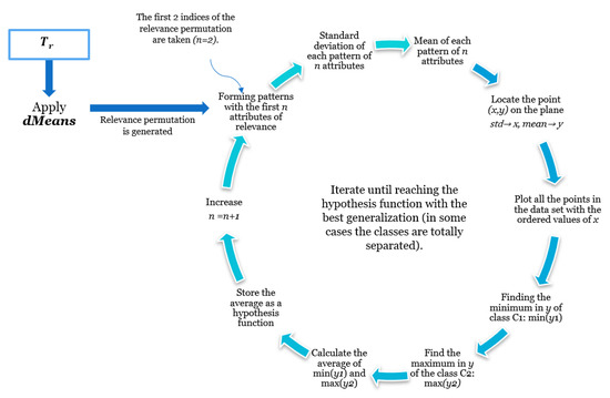 The dMeans algorithm takes as input the set . From , it detects the most relevant features of the dataset, generating what we will call Relevance Permutation (RP). In Algorithm 1, the operation of the dMeans algorithm is shown.