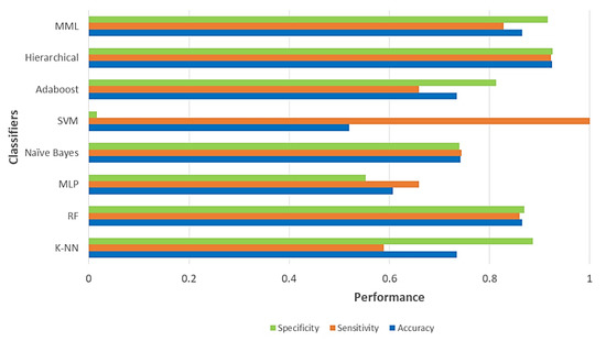 Table 3 shows the performances of the different classification algorithms proposed. These results show similar values. After performing Friedman’s statistical test, the null hypothesis was rejected with a confidence of 90% and a p-value of 0.0959, demonstrating the existence of statistically significant differences between the classifiers. Furthermore, the proposed MML methodology ranked second best in Friedman’s mean ranks measure for the comparative methods, while the MLP, Adaboost, and SVM algorithms remained with the highest averages, as shown in Table 3.