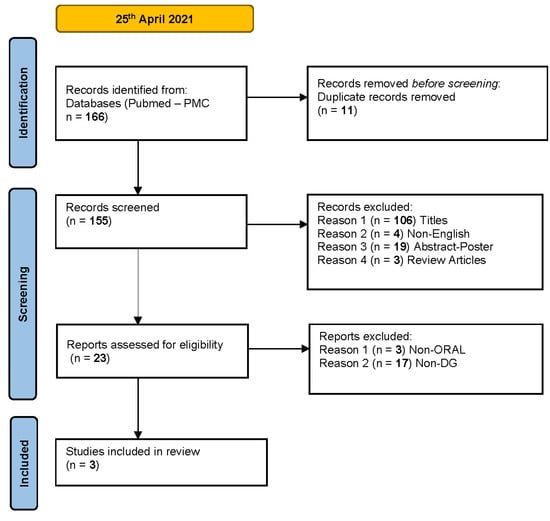 Duplicate articles were removed (11), leaving 155 for screening. Articles were rejected if the title was not appropriate, they were not in English, or if they were abstract-poster or review articles (132). The papers assessed for eligibility were 23, but 20 were excluded because they were not oral and/or not DG. Only three articles met our inclusion criteria: two case-reports and one case-series of three patients.