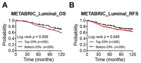 PKM2 is overexpressed in the breast tumors [42] and associated with poor BC prognosis in a meta-analysis [43]. We sought to further evaluate the clinical relevance of PKM2 expression in the luminal tumors using the METABRIC cohort defined by PAM50 [47]. Figure 1A shows that patients with high PKM2 expression exhibited a significantly worse 10-year survival than did those with low PKM2 expression (top 25% vs. bottom 25%, p = 0.005). A significantly worse relapse-free survival was also found for the top-quartile group as compared with the bottom-quartile one (top 25% vs. bottom 25%, p = 0.045) (Figure 1B). We also evaluated the clinical relevance of PKM2 expression in the basal and HER2 subtypes of BC tumors using the METABRIC cohort. Figure S1A shows that the basal subtype exhibited a significantly worse 10-year relapse-free-survival (RFS) (top 25% vs. bottom 25%, p = 0.046) but no significant difference in a 10-year overall survival (OS) outcome for the PKM2-high expression group. There was no significance for the HER2 subtype (Figure S1B).