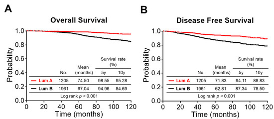 Patients with HR+/HER2− luminal BC (n = 3166, 2005–2013 at Chang Gung Memorial Hospital) were classified into two groups based on pathological and IHC features: luminal A (ER and/or PR+, Ki67 ≤ 20%, or grade 1) and luminal B (ER and/or PR+, Ki67 > 20%, or grade 2 or 3). The luminal B group exhibited a significantly lower survival rate than that of the luminal A group (10-year overall survival (OS), p < 0.001; 10-year DFS, p < 0.001) (Figure 2A,B), revealing the substantial outcome difference between the two subtypes in our hospital-based population.