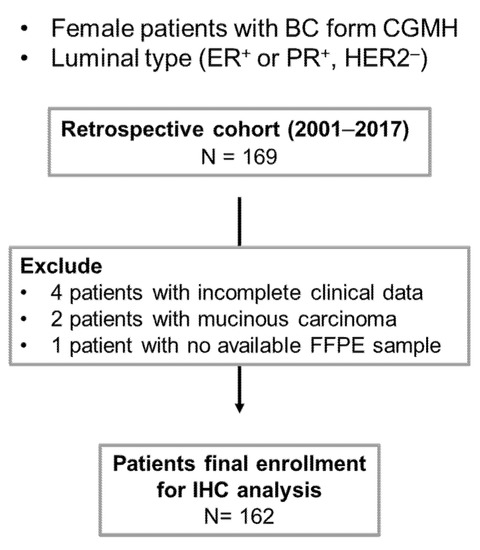 A total of 3166 HR+/HER2− luminal BC patients who had received therapy at Chang-Gung Memorial Hospital (CGMH), Linkou, Taiwan (2005–2013) were reviewed based on the pathological and clinical properties. The diagnostic criteria for HR+/HER2− luminal BC was based on the receptor status (ER, PR, and HER2) by IHC and HER2 amplification by fluorescence in situ hybridization (FISH) in invasive cancer as the following: HR+, more than 1% positive for ER or PR; HER2−, an IHC score of 0 to 1+, or 2+ with non-amplified HER2 by FISH. One hundred and sixty-nine HR+/HER2− patients who had concluding pathologic reports and no other malignancies were firstly selected. Seven patients were excluded for the following reasons: 4 cases with incomplete initial diagnostic information, 2 with mucinous carcinoma, and 1 with no available formalin-fixed paraffin-embedded block of the primary tumor. The final number of enrollments was 162, including 50 patients with documented recurrence and 112 patients without any recurrence over 10 years (Figure 1 and Table 1). Demographic factors of this retrospective cohort included age, history of diabetes, ER and PR status, tumor size, grade, TN stage, surgical treatment, chemotherapy use, endocrine therapy, and radiotherapy. The time and location of recurrence were documented. The study protocols have been approved by the Institutional Review Board of CGMH (IRB#201700716A3).