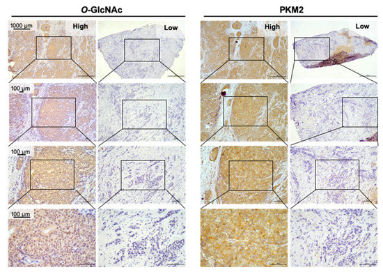 Consecutive paraffin-embedded serial sections of specimens (n = 162) were obtained from CGMH for single IHC staining of PKM2 and O-GlcNAc. The specimens were deparaffinized and rehydrated with xylene (Sigma-Aldrich) and ethanol (100% ethanol for 10 min, 95% ethanol for 5 min, 80% ethanol for 3 min, 70% ethanol for 3 min, 50% ethanol for 2 min, and then deionized water for 5 min). For antigen retrieval, specimens were incubated with citrate buffer at pH 6.0 (10 mM citrate, 0.05% Tween 20) and autoclaved at 121 °C for 20 min. The immunostaining procedures were performed using Novolink Polymer Detection System (Leica) according to the manufacturer’s manual. In brief, tissues were stained with anti-O-GlcNAc or anti-PKM2 for 60 min at room temperature. The working dilution of the primary antibody was 1:50 for anti-O-GlcNAc (838004, Biolegend, San Diego, CA, USA) and 1:100 for anti-PKM2 (D78A4, Cell Signaling Technology, Danvers, MA, USA). The IHC results were reviewed blindly by two pathologists (CJ Chen and YC Hsu) based on two parameters: the staining intensity score (0 = negative; 1 = weak; 2 = moderate; and 3 = strong), and the percentage of immunopositive cells (0–100) [48,49]. The Q score (0–300) was calculated by multiplying these two parameters. Two groups were stratified based on the Q score: low expression (Q ≤ mean) and high expression (Q > mean). Kaplan–Meier analysis was conducted to evaluate the clinical relevance.