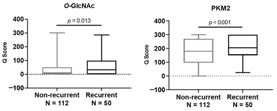 To assess the expression level of O-GlcNAc or PKM2 in relation to recurrence risk, patients were stratified into a non-recurrent or a recurrent group. As shown in Figure 5, high expression levels of O-GlcNAc (p = 0.013) or PKM2 (p < 0.001) were positively associated with the risk for cancer recurrence.