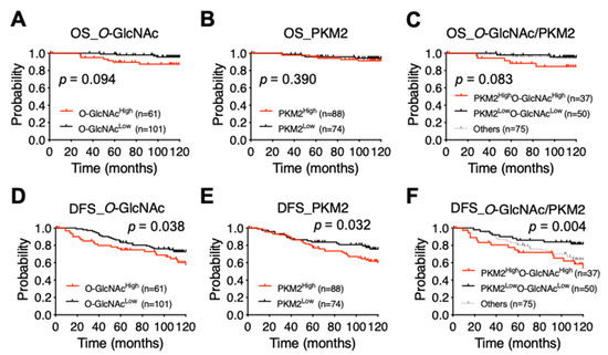 Furthermore, samples were stratified into two groups using the mean Q score as a threshold. A Kaplan–Meier survival analysis revealed that high expression of O-GlcNAc (O-GlcNAcHigh, p = 0.094), PKM2 (PKM2High, p = 0.390), or the combined double-marker status (O-GlcNAcHighPKM2High vs. O-GlcNAcLowPKM2Low, p = 0.083) were associated with worse overall survival, supporting a trend toward statistical significance (Figure 6A–C). Interestingly, high expression levels of O-GlcNAc (O-GlcNAcHigh, p = 0.038) or PKM2 (PKM2High, p = 0.032) were significantly associated with worse DFS (Figure 6D–F). Importantly, the combined double-marker status offered an even greater statistical significance (O-GlcNAcHighPKM2High vs. O-GlcNAcLowPKM2Low, p = 0.004) (Figure 6F). These results suggest that high expression levels of O-GlcNAc and PKM2 are associated with a high risk of recurrence and worse DFS.