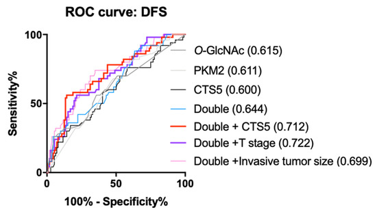 Next, we built the logistic regression models using PKM2, O-GlcNAc, and/or a clinical parameter (invasive tumor size, T stage, or CTS5) to evaluate the risk of the 10-year DFS outcome. Tables S8–S10 show that each marker (PKM2, O-GlcNAc, and an individual clinical parameter (invasive tumor size, T stage, or CTS5)) significantly contributed to the DFS outcome per triple-marker model. Since ROC analysis provides a means to assess the diagnostic ability of a binary classifier system and select possibly optimal models [50], we next conduct ROC analysis to comparing the performance of PKM2 and O-GlcNAc in combination with another clinical parameter (invasive tumor size, T stage, or CTS5). Interestingly, the ROC curve analyses revealed that the best performance was seen for the O-GlcNAc-PKM2-T stage model (AUC = 0.722), as compared with the O-GlcNAc-PKM2-the invasive tumor size model (AUC = 0.699) and the CTS5-O-GlcNAc-PKM2 model (AUC = 0.712) (Figure 7). A reduced performance was seen for a single-marker alone (PKM2, O-GlcNAc, or CTS5) or the O-GlcNAc-PKM2 model (Figure 7). Together, these results suggested that the expression of O-GlcNAc and PKM2 provided extra information in addition to the clinical factors. Importantly, T stage, PKM2, and O-GlcNAc served as the best prognostic discriminators in the 10-year DFS outcome, offering an improved prognostic indicator for HR+/HER2− luminal BC.