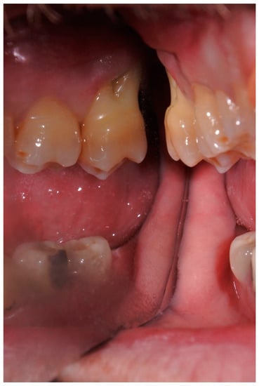 Extraoral examination showed non-palpable lymph nodes and no facial swelling. Intraoral examination showed a lack of some teeth, the presence of tooth-fixed prosthesis and conservative restorations. There was persistence of deciduous lower incisors with agenesis of permanent counterparts. In tooth 1.7., there was a severe gingival recession with a decreased attachment level (CAL) on the vestibular and distal surface (mesiovestibular = 5 mm; middle vestibular = 6 mm; distovestibular = 7 mm), with complete furcal exposure, grade 2 mobility and pain on percussion testing (Figure 1). A thermal vitality test did not elicit responses. All the other teeth were painless on percussion testing. A periodontal probing showed, over a gingival recession of 5–7 mm from the cementum–enamel junction, a pathologic probing depth (PD) on the vestibular and distal surface (mesiovestibular = 5 mm; middle vestibular = 5 mm; distovestibular = 4 mm). Probing was associated with pain and bleeding. The radiographic exam showed a severe horizontal bone loss and absence of tooth decay. A horizontal radiolucent line in the third apical root was also observed (Figure 2A). According to the new AAP classification of periodontal diseases, the presumptive diagnosis was of endo-periodontal lesion with root damage Grade 3. Examining the old radiography, a deep interproximal bone defect between 1.8. and 1.7. was observable, but no bone defects were observed between 1.7. and 1.6., and the radiolucent horizontal root line was absent (Figure 2B).