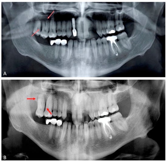 Orthopantomography of 2018; bone defects were not observed between 1.6. and 1.7. (panel A). Orthopantomography repeated in 2021. A severe horizontal bone loss and absence of tooth decay were observed. A horizontal radiolucent line in the third apical root was present (panel B). Red arrows indicate the lesions.