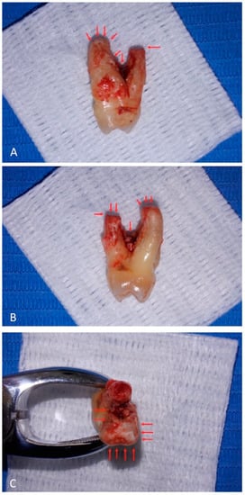 Decay or leakages are not appreciable on tooth crown surface. Root surfaces present adherent granulation tissue. The palatal root, on the right (panel A) and on the left (panel B) views, presents apical horizontal resorption. Root furcation shows adherent granulation tissue and biofilms. On the top view (panel C), apical resorption of the palatal root is evident (upper side), and adherent granulation tissue reaches the apical region of the vestibular root (lower side). Red arrows indicate the lesions.