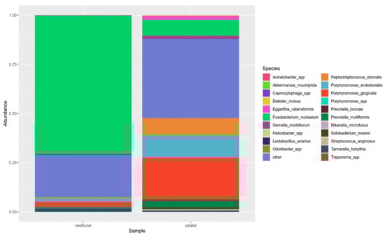 Relative abundance of taxa in the vestibular and palatal samples. The top 15 species and genera are shown.