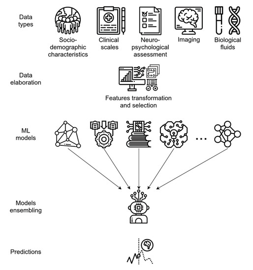 Decades of experimental and clinical research have contributed to unraveling many mechanisms in the pathogenesis of the disease, such as the β-amyloid hypothesis, but the puzzle remains incomplete. Clinical and biological data from electronic health records and multi-omics sciences represent a potentially unlimited amount of information about biological processes, such as genomes, transcriptomes, and proteomes, which can be explored through Big Data exploitation [8,13]. The rapid collection of data from tens of thousands of AD patients far exceeds the human ability to make sense of the disease.