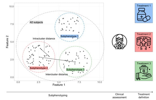 When a huge amount of multi-modal data relative to patients are available, clustering tools, as unsupervised learning applications, can allow for the identification of some sub-groups of individuals that share common characteristics and, hence, improve the development of new targets for tailored treatment strategies. Members within each cluster have high homogeneity for a subset of attribute values, whereas there will be high heterogeneity between different clusters (Figure 4). Evaluation of MCI patients is often noisy, due to the fact that cognitive impairment can have different etiology and manifestations, as defined by multiple biological and clinical factors [94,101,102]. Various applications of unsupervised learning can highlight such complex patterns across subjects or patients, which even an expert clinician may find difficult to discern.