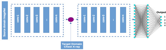 CNNs have increasingly been used in vision tasks such as detection, classification, and segmentation [55,56,57,58,59]. CNNs take a biological inspiration from the visual cortex. The visual cortex is a region of the brain that has cells that are sensitive to visual perception. The adoption of CNNs in ML stems from a research conducted by Hubel and Weisel in 1962 where they demonstrated that some individual neuronal cells in the brain fire or activate only in the presence of certain edges and in specific orientations [60]. A CNN architecture consists of a convolutional, pooling which is used for down-sampling then followed by a non-linear activation and a fully connected layers. The convolutional has a filter that acts as a feature detector and selection. The convolved region is known as the receptive field. The output of a convolution is a feature or activation map which serves as input to deeper layers of the network. The role of the filter (a concatenation of kernels) is to detect low level features such as edges, colors, curves, virtual lines, boundaries, and high level features such orientations, local surfaces and discontinuities as was first proposed by Marr [61]. In this paper, ImageNet (i.e., a dataset with over one million images and a thousand categories of objects) was used as the source domain for the basis of transfer learning to chest X-ray images. Figure 1 shows the proposed architectural framework for this representational transfer learning task. Transfer learning is a well-suited framework for healthcare computer vision tasks where target domain datasets for learning are significantly small, and model generalization is a key consideration.