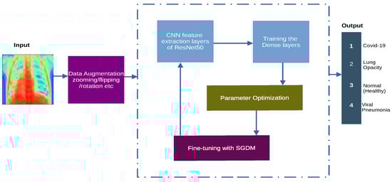 A high-level overview of our proposed transfer learning framework is presented in Figure 2. The initial stage is dataset setup, which includes loading both the brain chest X-ray image scans and associated class labels followed by batch normalization and cross-validation split into train, validation and test sets. We used various data augmentation approaches such as zooming, flipping, rotation, mirroring, etc. to make the model generalize better. Afterwards, we used ResNet50 CNN architecture, Stochastic Gradient Descent for the transfer learning framework.