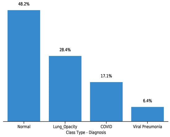 To understand the underlying signal distribution in the chest X-ray image dataset, we performed exploratory data analysis. Figure 3 gives a histogram of the dataset class distributions. Healthy and Lung Opacity samples compose 80% of the dataset. Given that our primary objective is to recognise COVID-19 patients to aid early diagnosis thus preemptive medical care, the figure indicates a problem of class imbalance. Viral Pneumonia is the least represented class indicating 6.4% of the total dataset, thus in such situation Precision, F1-Score or Recall are better suited as metrics in contrast to accuracy.