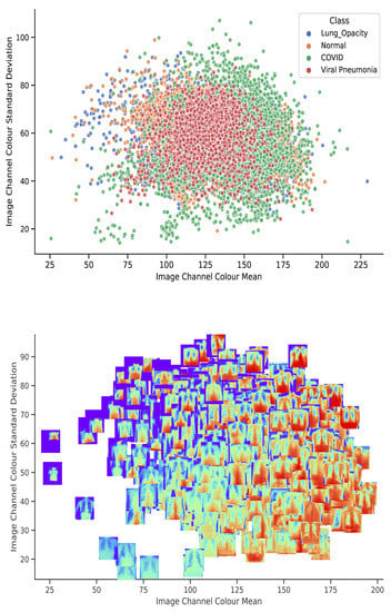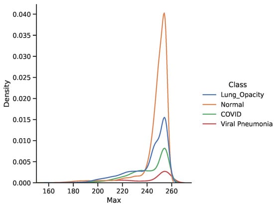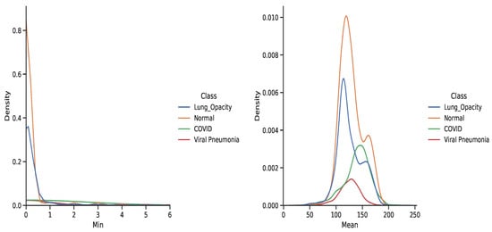 The dataset contains a substantial number of images compared to existing literature [4,66,67]. However, due to privacy concerns, additional clinical information about patients is not available. Thus, we proceed with the investigation of image patterns and relationships between the classes. The data are unbalanced with almost 50% of samples belongs to the “Healthy” class that may bias the model towards this class in terms of performance. The X-ray images are rank three tensors that represent the height, width, and number of channels. We proceed by examining the inherent pattern between the image colour values and their class. Figure 4 and Figure 5 show the RGB color intensity distributions for the four classes which is scaled between 0 to 255-pixel intensities for the individual image classes. The distribution illustrates how the minimum, mean, and maximum colour values are presented in the dataset.