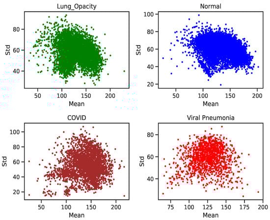 We continue by observing the relationship between a sample X-ray image mean as shown in Equation (1) and its standard deviation using Equation (2):