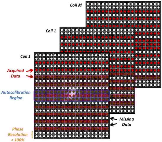 Exemplary sampling pattern used for the k-space data acquisition (red arrows point to the acquired date; black arrows point to the missing data). Along the phase encoding direction, data are under sampled by an acceleration factor R. An autocalibration region covering the center of k-space is acquired, either along with the imaging acquisition or separately with a different image contrast. A fraction of the periphery may be skipped, usually referred to as phase resolution.