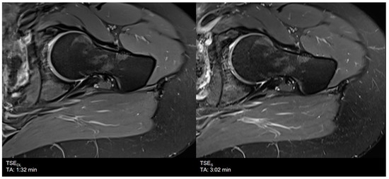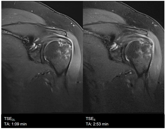 Example of a Deep Learning (left) and standard (right) PD-weighted turbo spin echo image of the shoulder in coronal orientation.
