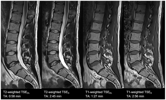 Example of a Deep Learning and standard T1- (right) and T2-weighted (left) turbo spin echo image of the lumbar spine in sagittal orientation. Note that TSEDL show lower extents of noise both in T1- and T2-weighted imaging. Nonetheless, some small structures, such as small bone canals, disappear; there is no impact on the delineation and assessment of relevant anatomical structures in both TSES and TSEDL.