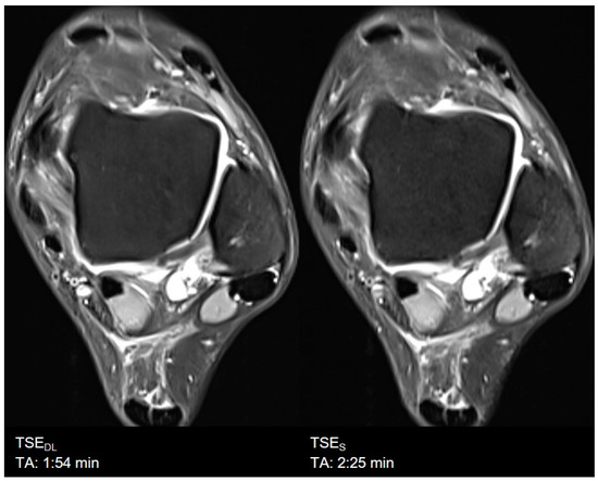 The overall clarity of anatomic structures was rated excellent for TSEDL (median 4, IQR 4−4) and comparable to TSES (p > 0.05). Furthermore, the assessment of the articular cartilage, the delineation of ligaments and tendons were all rated excellent and to be comparable between the two sequences (median 4, IQR 4−4, p > 0.05). The assessment of the bone was rated to be lower in TSEDL (median 4, IQR 4−4) compared to TSES (median 4, IQR 4−4). There was no significant difference regarding the diagnostic confidence between both sequences (median 4, IQR 4−4, p > 0.05).