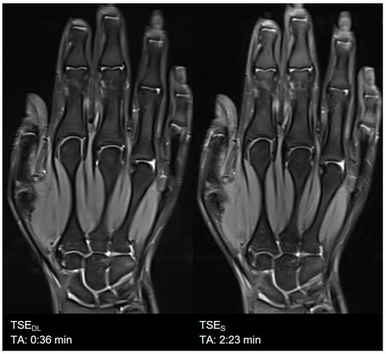 The fact that DL-based reconstructed images exhibit even lower noise levels than corresponding fully sampled conventional acquisition techniques, and may therefore look artificial to experienced radiologists, was already discussed in prior studies [15,23] and is in line with our findings: TSES is rated to have a more realistic image impression compared to TSEDL. The low extent of noise may also be the cause of the lower ratings of the assessment of the bone, due to almost noise-free image impression, in which very small structures disappear. Nonetheless, this is only an impairment of the image impression and there is no impact on the diagnostic accuracy since TSEDL exhibited excellent diagnostic confidence.