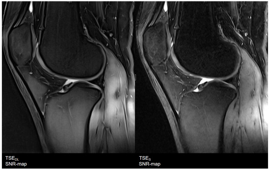 Exemplary visualization of signal-to-noise ratio (SNR) as SNR-maps. On the (left), results of the TSEDL dataset, and on the (right), of a TSES dataset of knee in sagittal orientation. The TSEDL dataset shows lower noise levels and an increase of SNR with a more homogeneous distribution compared to the TSES dataset. In addition, SNR levels throughout the whole image are more homogeneous.