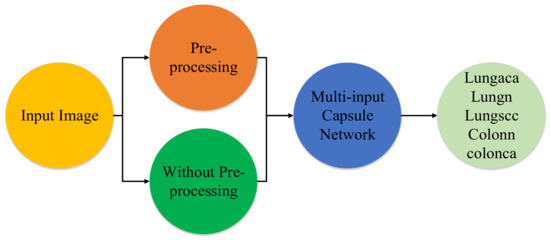 Convolutional neural networks have been used in practically almost all deep learning algorithms for medical image classification since their re-emergence [19,20,21]. There are two fundamental forms of convolutional neural networks, each with a somewhat different working principle. Conventional convolutional neural networks and separable convolutional neural networks are the two varieties. Capsule Networks, on the other hand, are gaining popularity in medical image classification due to their lightweight models [22,23]. As a result, in this research, we use a hybrid strategy to classify lung and colon cancer histopathology slide images by combining conventional convolutional layers [24], separable convolutional layers [25], and a capsule network [26]. Pre-processing the images to balance the colors and maintain overall detail for better feature learning is a crucial aspect of this research, in addition to the proposed network.