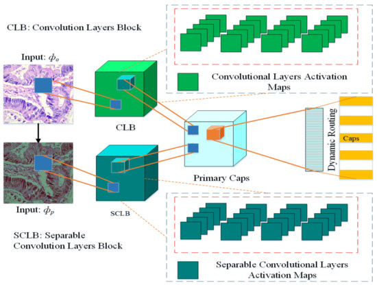 In Capsule Networks [50], the capsules are a set of neurons where activity vectors include numerous orientation properties as well as their length. The probability of a certain entity’s existence is represented by these activity vectors. Because the pooling layers are the weak links in CNNs, these processes could easily remove or dilute image features, causing basic object structures to be disrupted [52]. Therefore, they are substituted by a more suitable procedure known as “routing-by-agreement”. The outputs are received by parent capsules in the following layers based on this rule, however, their coupling coefficients differ. Each capsule tries to produce an output that is as similar to the parent capsule’s output as possible; if they succeed, the coupling coefficient between these capsules increases [53]. Let be the output of the ith capsule, its predicted output for the jth parent capsule can be acquired as: