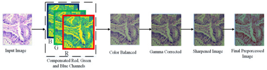 - Enhance feature learning of the deep learning models by pre-processing histopathological slide images by sharpening, gamma correction and multi-scale fusion.