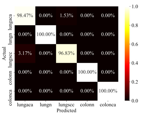 The proposed model has been rigorously evaluated on test data in order to determine how well it performs on data that has never been seen before. To ensure that the evaluation is fair, the test data was also pre-processed and structured in the same way. The model’s performance on test data is reported in Table 3. The confusion matrix for the same test data is depicted in Figure 7. The model performs well in all categories, but particularly well in identifying colon adenocarcinomas, with 100% prediction accuracy, precision, recall, f1-score, and AUC. Similarly, the model has a 98%, 99%, and 100% accuracy for lung adenocarcinomas, lung squamous cell carcinomas, and lung benign. Sensitivity and specificity are likewise encouraging for all of the classes. In terms of performance, the AUC values for all classes are 100%, which is exceptional.