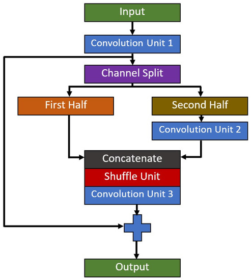 The initial feature map size to this module is 64 × 64 pixels and the output feature map size at the end of this module is 8 × 8 pixels. Therefore, the range of the feature map size for this module is considerably small in order to maintain the lightweight nature of the proposed model. There will be three convolution operators in each , where its full building block is shown in Figure 2. Residual-Shuffle-Net utilizes a bottleneck design for the convolution operations; as such, the middle convolution operator will have a smaller number of the filter set compared to the first and third convolution operators. The residual skip connection input layer comes from the output of the first convolution, which will be added to the output of the third convolution. Group and shuffle operations are performed during the second convolution operation, in which a simple channel split procedure is used to divide the feature maps into two equal groups, where it will be combined back using a concatenate operator. The addition of group and shuffle operations force the network to learn from various sets of feature branches, instead of one set of general features [45]. The design of sequential allows the network to learn multiple local features instead of global features in each convolution layer.