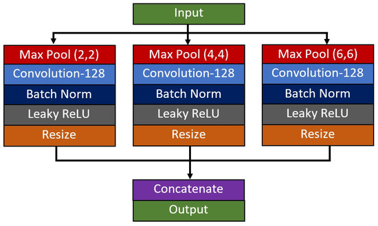 The final module utilizes a spatial pyramid pooling () unit, followed by a composite function of global average pooling and dense connection. Since this study focuses on a three-class problem, a SoftMax activation function with three output classes is used to come out with the likelihood of an image belong to each respective class. The unit is added with the goal of improving the network’s capability in extracting multi-scale features of the diseases from X-ray images. In this paper, the dataset used to validate the network performance consists of diseases from various severity levels of COVID-19. Thus, the size of the air pocket seen in the X-ray images varies in size, and some of them are difficult to identify and differentiate using naked eyes, especially for the case between COVID-19 and other types of pneumonia cases. In line with the previous reasoning, three parallel branches of down-pooling operators are employed to extract the multi-scale features, which will be resized and concatenated back at the end of the unit. Since the input feature map size is 8 × 8 pixels, a set of 2 by 2, 4 by 4, and 6 by 6 down-pooling kernels has been utilized to produce equally spaced down-pooling scales as shown in Figure 3.
