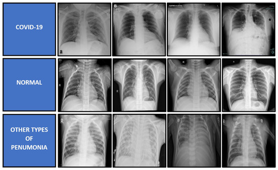 Samples of X-ray images for each category of COVID-19, normal and other types of pneumonia cases.