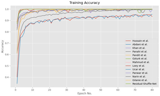 Training accuracy for Residual-Shuffle-Net and all of its benchmark methods.
