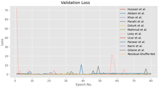 In general, all the tested methods have been trained until convergence for both accuracy and loss functions as shown in Figure 5 and Figure 6, respectively. During the training phase, the error for all CNN models converged towards zero value, while the accuracy for 10 out of the 12 models converged towards maximum accuracy of 1.0. Besides that, the other two models by Panwar et al. [22] and Hussain et al. [41] have converged to 0.95 accuracies after 80 epochs of training update. The convergence pattern assumption is also supported by the validation loss curves as shown in Figure 7 that proved the Residual-Shuffle-Net and all the benchmark methods have been trained until convergence. The trend for both training and validation losses for all methods has converged towards zero error. Although there are six performance metrics were calculated in this study, two of them carry more weightage in determining the best detection method for COVID-19 screening. The goal of the screening stage is to detect as many true positive cases as possible that will be confirmed later by the RT-PCR test. Therefore, the and metrics were prioritized in ranking the benchmark methods, where both of them measure a certain ratio of positive cases over the total number of cases. However, it is worth noting that the false negative metric still plays an important role in COVID-19 screening. A screening method will be rendered useless if none of the cases were screened at the early stage, which will directly increase the cost of healthcare to the government. Table 3 shows the performance of the Residual-Shuffle-Net and its benchmark methods using all six performance metrics, which were ranked using and . As a whole, Residual-Shuffle-Net performed the best in five out of the six evaluation metrics, except for the total number of parameters. It achieved the highest and with 0.97390 and 0.97403, respectively, while maintaining a relatively lightweight model with just 2 million parameters.