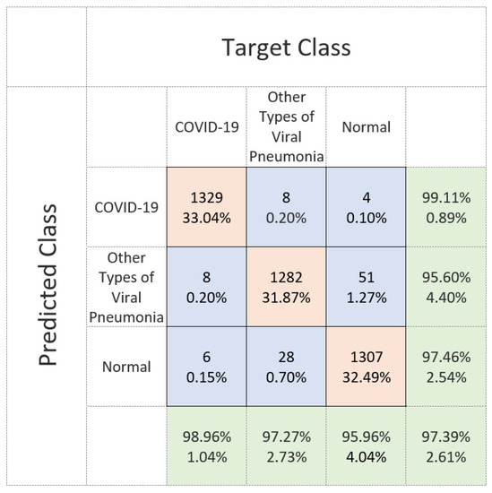 Confusion matrix performance of the Residual-Shuffle-Net in identifying the three classes of COVID-19, normal and other types of pneumonia cases using frontal chest X-ray images.